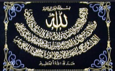 ALLAHU LAA ILAAHA ILLA HUWAL HAYYUL QAYYUMU. LAA TA’KHUDZUHUU SINATUW WA LAA NAUUM. LAHUU MAA FISSAMAAWAATI WA MAA FIL ARDHI. MAN DZAL LADZII YASFA’U ‘INDAHUU ILLAA BI IDZNIHI. YA’LAMU MAA BAINA AIDIIHIM WA MAA KHALFAHUM. WA LAA YUHITHUUNA BI SYAI-IN MIN ‘ILMIHII ILLAA BI MAASYAA-A. WASI’A KURSIYYUHUSSAMAAWAATI WAL ARDHA. WA LAA YA-UDHUU HIFZHUHUMAA WAHUWAL ‘ALIYYUL AZHIIM